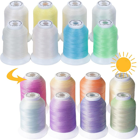 - Product Description: Those thread colors change rapidly after being exposed to ultraviolet light, and gradually return to the original colors when there is no ultraviolet light for a few minutes. This color changing effect can occur repeatedly.