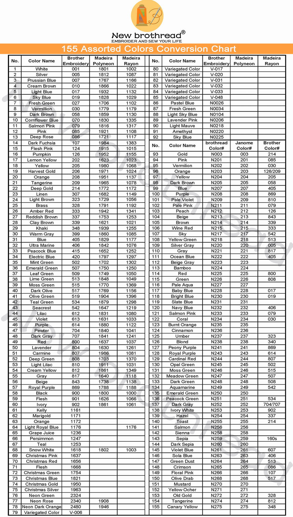 If you need conversion chart for Janome Color and Brother Color, Please feel free to contact us by email, we will send to you ASAP.