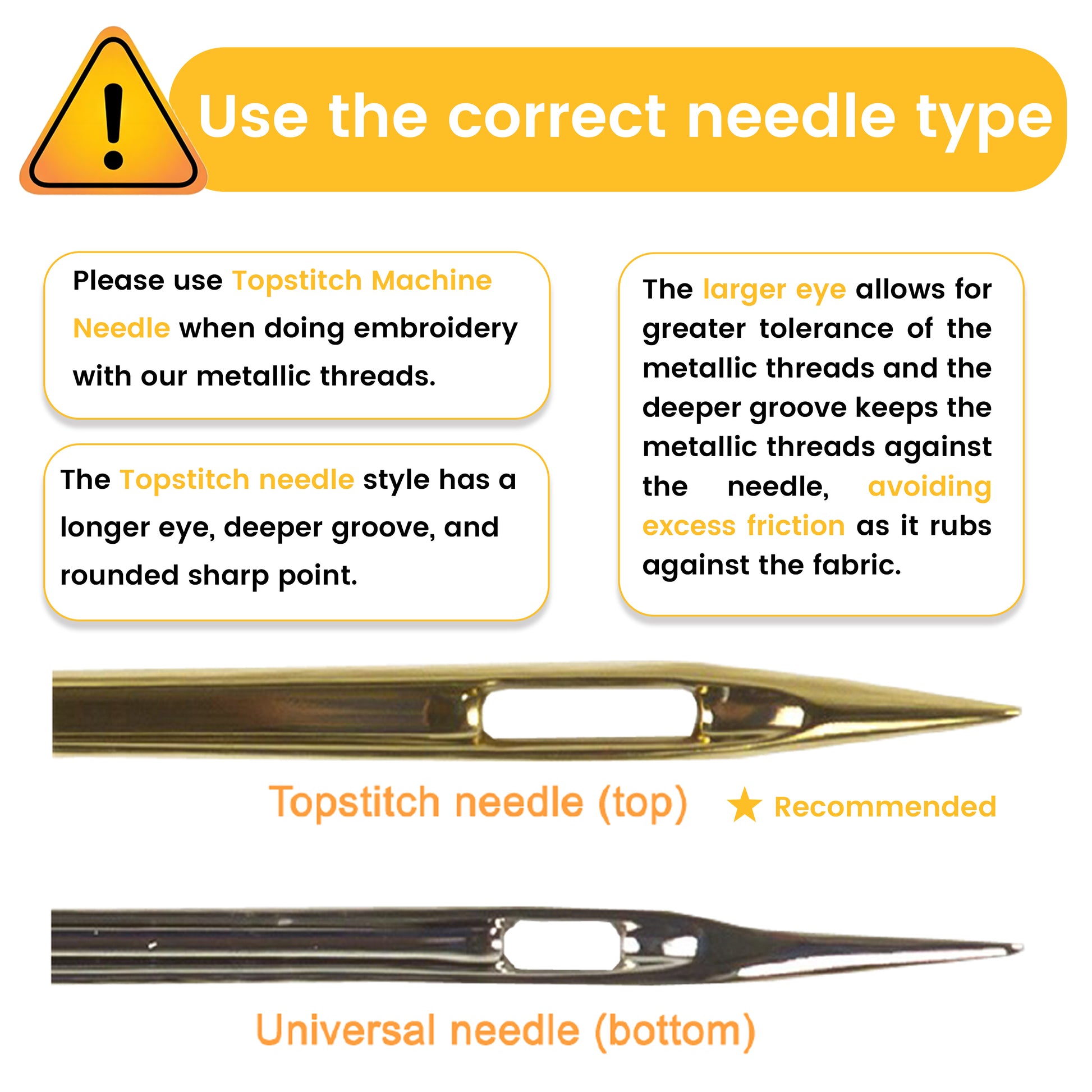 ★Tips of Working with Metallic Thread - Considering metallic threads are a little tricky than normal embroidery threads, please use Topstitch Machine Needle with large eye to prevent stripping, the suggested is Topstitch 80/12 or 90/14 and Organ HAX1 SP 80/12 or 90/14; if you meet tangled problem during embroidery, please put proper thread net outside of the spool; adjust the tension of machine, until you can pull the metallic thread on machine smoothly; lower the speed of stitches to ≤600.